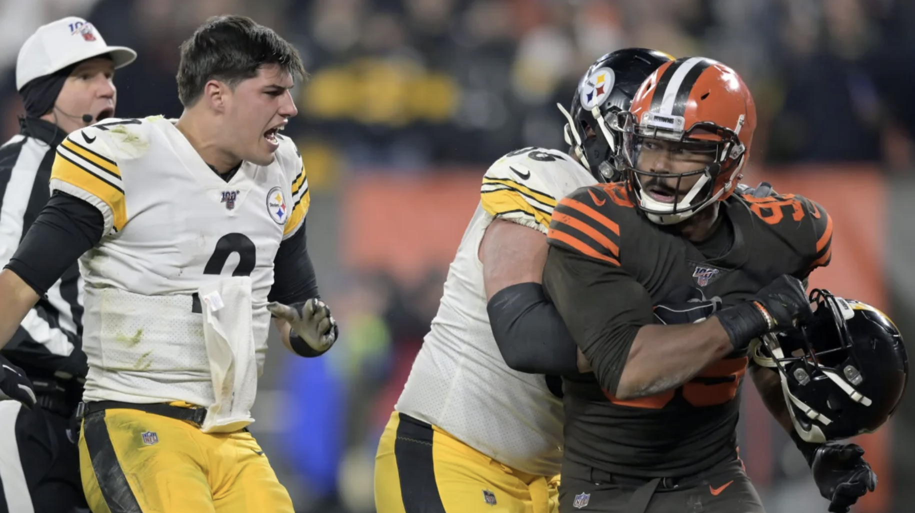 Cleveland Browns defensive end Myles Garrett (right) reacts after swinging a helmet at Pittsburgh Steelers quarterback Mason Rudolph (left) in the fourth quarter of an NFL football game Nov. 14 in Cleveland. The Browns won 21-7.