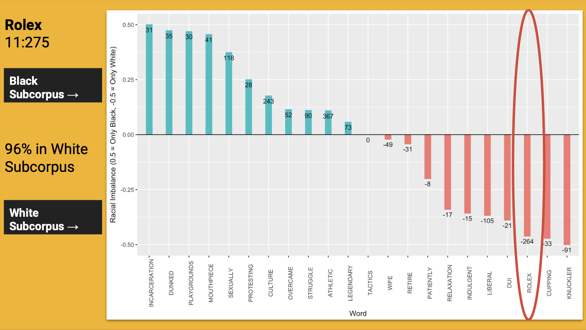 The ratio of 11:275 reveals that the word Rolex is heavily racialized, as it was much more often associated with the White athletes than the Black athletes in the sample of mainstream sports broadcasting.