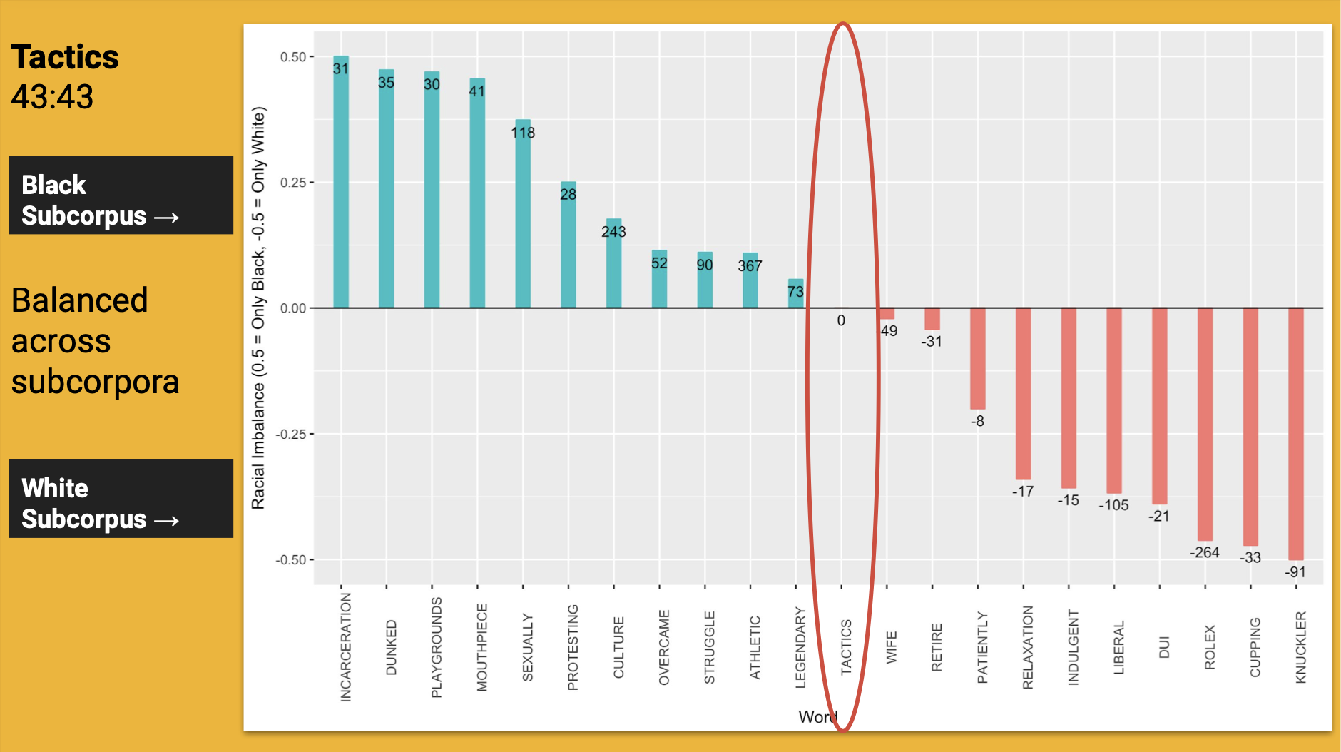The ratio of 43:43 reveals that the word tactics was the only monitored word that showed an equality in usage among the Black and White Subcorpus.